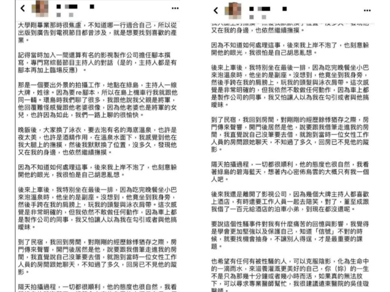 After graduation, the aforementioned woman did not know which job was best suited for her, so she ventured into many different fields. One of the jobs she had years ago was a scriptwriter at a somewhat famous film and television production company. This job turned out to be a traumatising one for her as she was sexually harassed by a frontline TV host with the surname ‘Xu’.