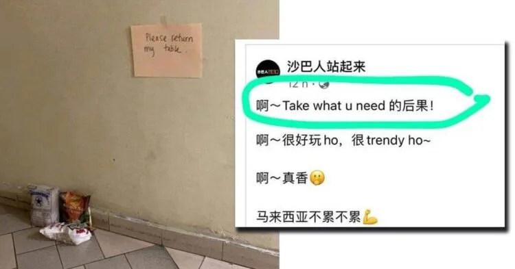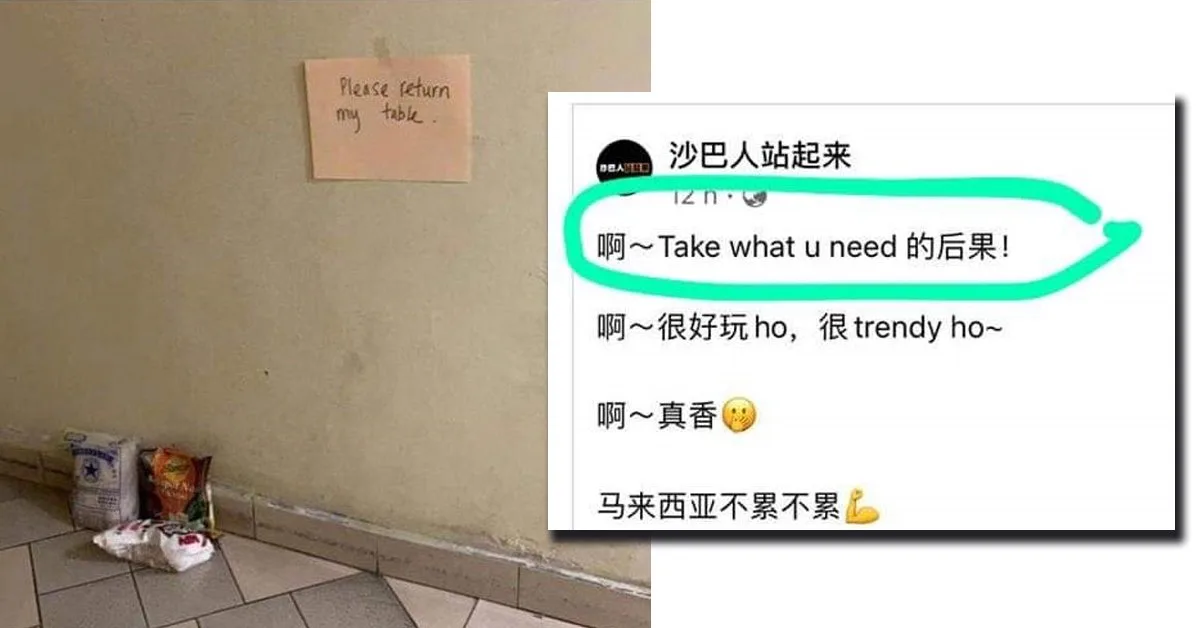Someone who had set up a small table with some food and household items was shocked to find that even the table had gone missing when they returned. The person even had to write “Please return my table” on an orange piece of paper.