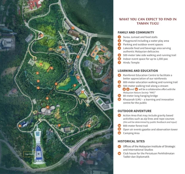According to Khazanah Nasional managing director Tan Sri Azman Mokhtar, Taman Tugu will present “various world-class facilities in several zones, especially revolving around the environment, recreation and learning including a rainforest information centre”.