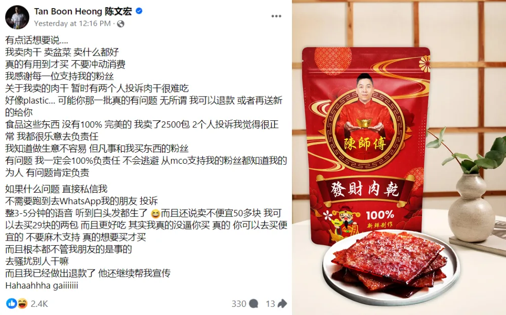 He also urged his customers to contact him directly with their complaints rather than harass his friends about it. Apparently, one of his customers had sent a voice message to Boon Heong’s friend claiming the bakkwa wasn’t cheap nor was it delicious. “I didn’t force you to buy it,” he pointed out. “You can buy cheaper ones. Don’t blindly support (me). Only buy (my products) if you really want to buy them.”
