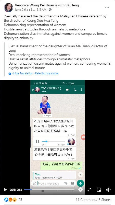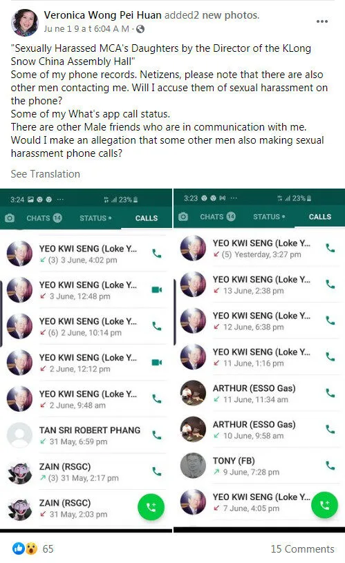 According to Wong’s Facebook post, made on 16th June, she accused Yeo of harassing her via WhatApp messages and calls. Wong stated the messages were sexual in nature and included pornographic videos. She also included screenshots of the messages and videos.