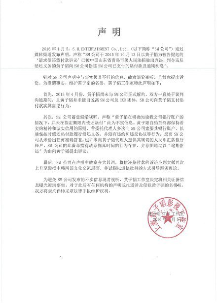 In response to the announcement, Tao’s side released a statement through his workshop’s Weibo account, claiming that “the statement that SM Entertainment revealed on 5th January is untrue”.
