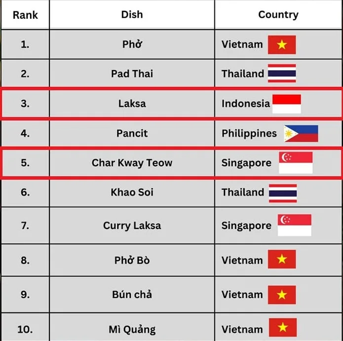 A list of the Top 10 Most Popular Noodle Dishes in Southeast Asia was recently released by TasteAtlas. The list has been reposted on social media and netizens, especially Malaysians, are not happy about it. Popular dishes like Laksa, Char Kway Teow, and Curry Laksa made it onto the list but much to everyone’s disappointment, those dishes were not labelled to be from Malaysia.