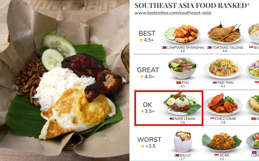 On 7th March, TasteAtlas posted their ranking of Southeast Asian food. Nasi lemak was the only dish from Malaysia to make the list. Additionally, it was rated 3.5+ (over 5), and was casually ranked as an “ok” dish. It was beaten out by Philippines’s Lumpiang Shanghai and Tortang Talong, Indonesia’s Chicken Porridge and Satay, Vietnam’s Pho and Thailand’s Pad Thai. Needless to say, netizens weren’t happy.
