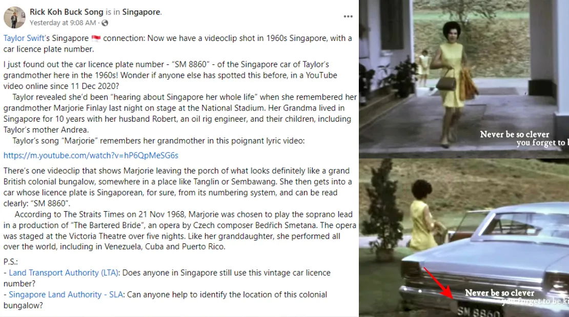 In the video, Taylor’s grandmother was seen walking out of a British colonial bungalow before hopping into a car. It was discovered that the vehicle had a Singapore-registered license plate after closer inspection. The writer also provided more information on a 1968 article about Marjorie who was cast to play the soprano lead in “The Bartered Bride”, an opera by Czech composer Bedřich Smetana. The production was staged at the Victoria Theatre over five nights.