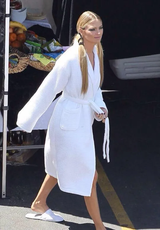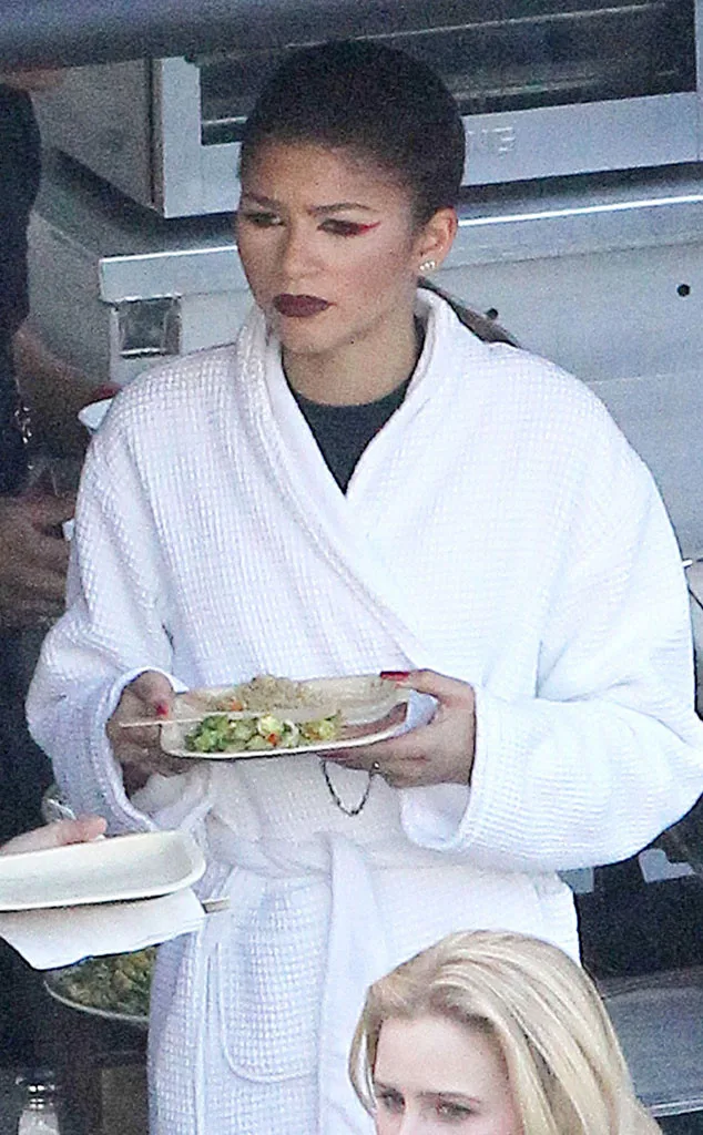 The ladies were spotted wearing white robes, spotting Swift’s signature cat eye makeup, rocking futuristic side-swept hairstyle, and snacking on the set of the music video.
