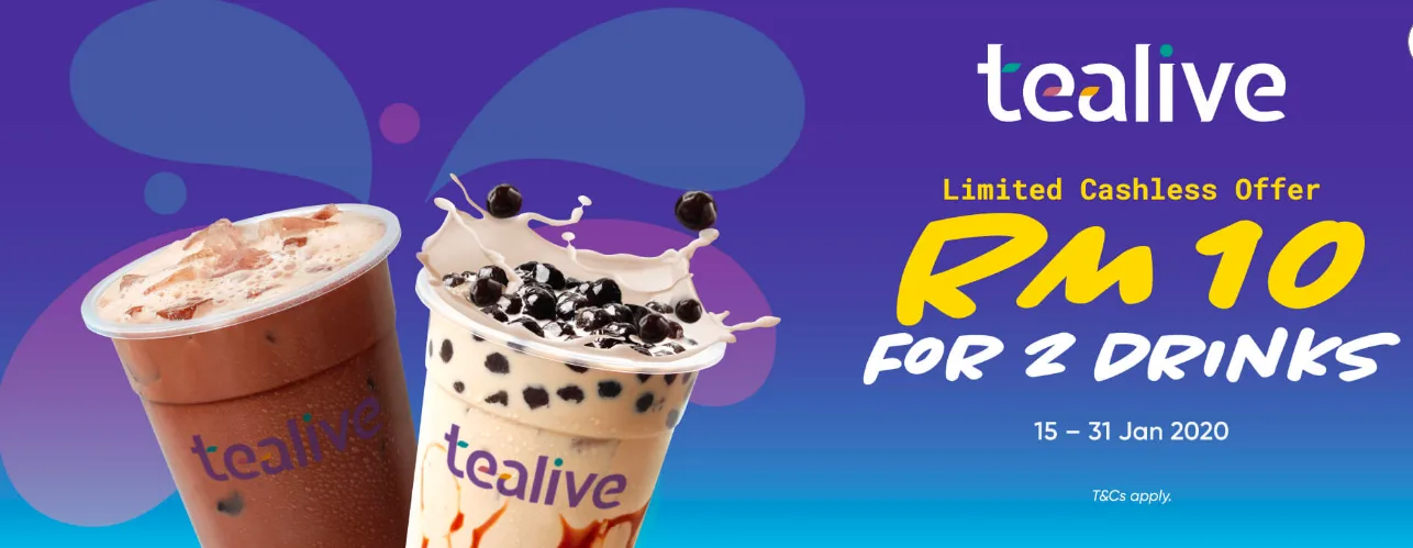 - Purchase Two (2) drinks of Tealive drinks valued at RM6.60 per drink for only RM10 (subject to 6% Sales and Service Tax) with “Pay” function using the Touch ‘n Go eWallet at participating Tealive outlets.