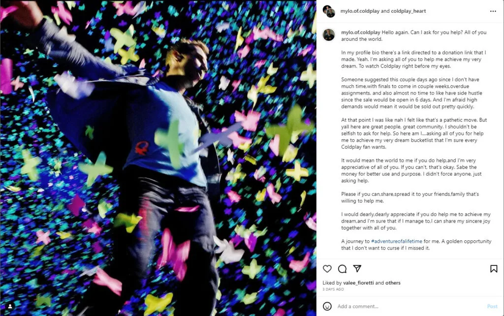 Shortly after news of Coldplay’s concert and ticket prices went viral, this 19-year-old teen took to his socials to ask for help. “I’m asking all of you to help me achieve my dream,” he stated in his post on Instagram. “To watch Coldplay right before my eyes.”