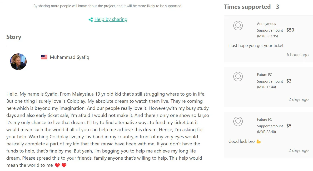 But, regardless of what some think, the 19-year-old’s pitch has worked somewhat. So far, he’s garnered $58 (~RM259.78), over the course of three days. He still has some time before the ticket sales end, but it’s uncertain if he will be able to reach that point.