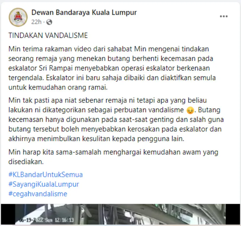 A CCTV footage of the Sri Rampai LRT station was uploaded by Dewan Bandaraya Kuala Lumpur on Facebook yesterday (Monday, 20th June) where we can see a group of teenage boys going down the stairs but one of them decided to go and press the emergency stop button on the escalator.