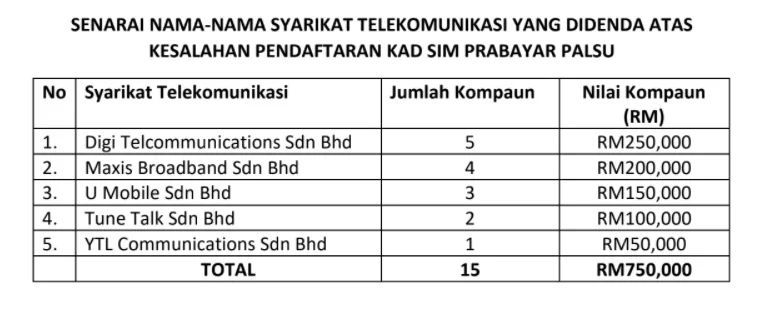 Five telco companies have been fined RM750,000 in total after failing to register new prepaid SIM cards with required ID verification.