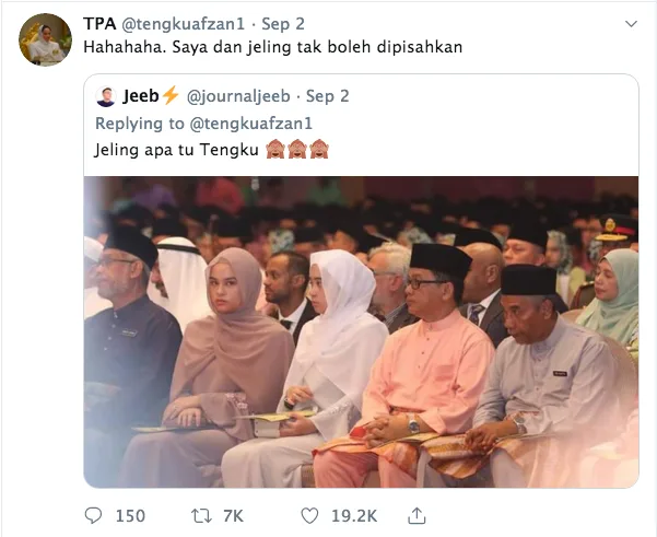 An internet user known as @journaljeeb (Twitter username) pointed out her facial expression in the picture, asking her “What are you glancing at, Tengku?”. She then retweeted the tweet by jokingly said “Hahahaha I’m always glancing.”