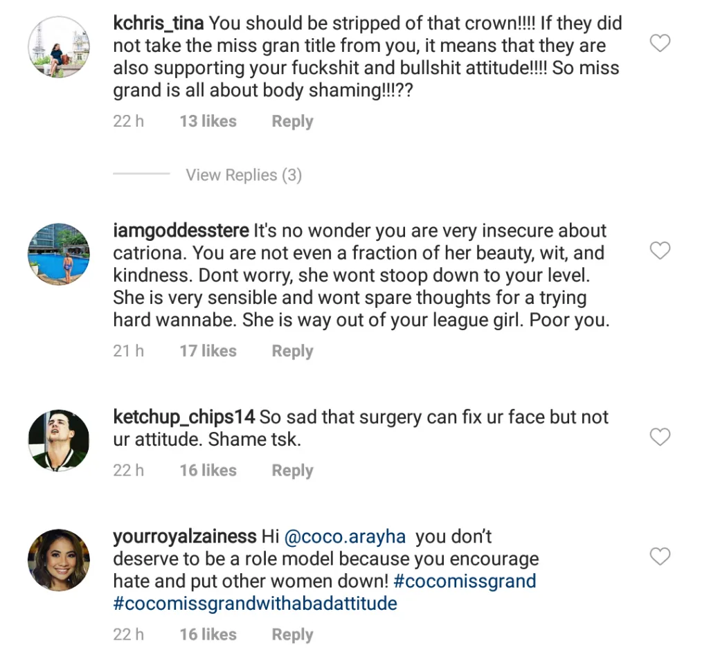 Neither Catriona or Coco have responded to the issue, but pageant fans have demanded Coco to publicly apologise to Catriona.
