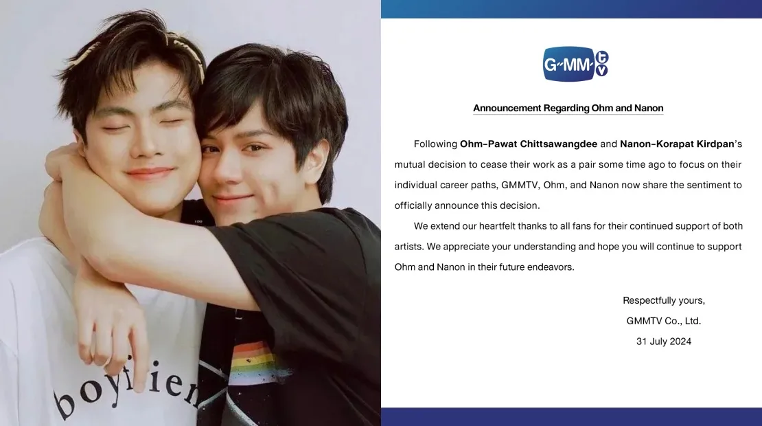 In an official statement, the company clarified that the two stars are currently focusing on their respective solo careers and decided to cease their joint work as a duo. “We extend our heartfelt thanks to fans for their continued support for both artists. We appreciate your understanding and hope that you will continue to support Ohm and Nanon in their future endeavours,” the agency wrote.