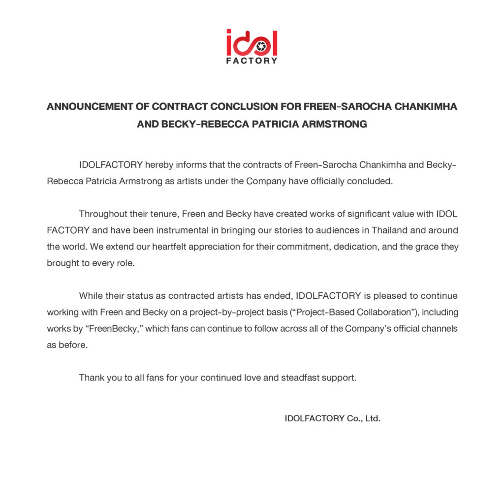 On 14th October 2025 (Tuesday), DOLFACTORY announced that Freen and Becky’s contracts with the agency have ended, and they have effectively departed from IDOLFACTORY. The statement in English reads, “IDOLFACTORY hereby informs that the contracts of Freen-Sarocha Chankimha and Becky- Rebecca Patricia Armstrong as artists under the Company have officially concluded.”