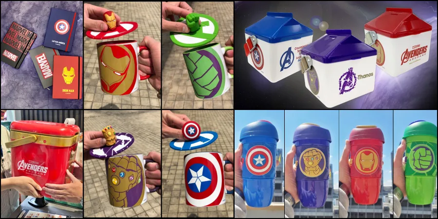 There are breakfast box set that comes with matching cup and spoon, glass mugs with cute covers featuring “Avengers” characters, water bottles, umbrellas, coolers, phone grips, neck pillows, notebooks, and more!