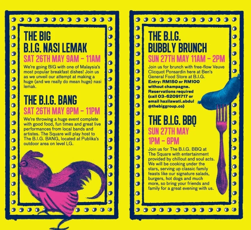 The B.I.G. Bubbly Brunch will be held at Ben’s General Food Store within Ben’s Independent Grocer and is strictly reservations-only (03-62091717). Prices are RM150 per pax or RM100 without champagne.