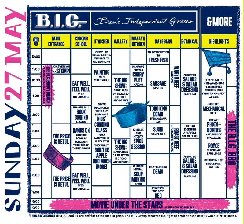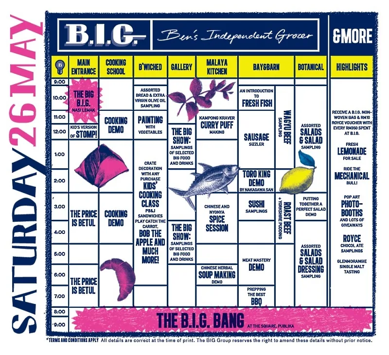 A jam-packed line-up of activities, tastings, samplings and games will be scattered throughout B.I.G. and various locations around Publika. Within B.I.G., shoppers will fully experience everything the supermarket has to offer, with activities such as curry puff making demos, sashimi slicing sessions and a plethora of fun and games for children. Highlighting “Barn Butchery” will be the “Sausage Sizzler“, an Australian-influenced hot dog cookout as well as a “Meat Mastery” demo by B.I.G.’s Chief Butcher, Daniel Greig.
