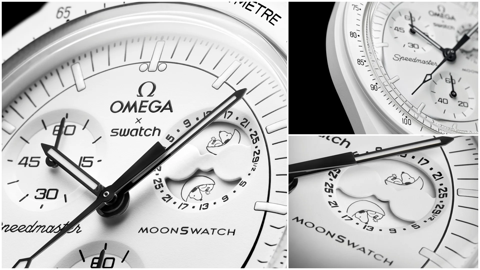 All of the main features of the original Speedmaster Moonwatch, the first watch to go to the moon, can be found on the Bioceramic MoonSwatch MISSION TO THE MOONPHASE: the asymmetrical case, the famous tachymeter-scaled bezel with the dot over the 90 and the typical Speedmaster subdials. The Bioceramic MoonSwatch MISSION TO THE MOONPHASE watch features its mission statement on the caseback, and the OMEGA X SWATCH logos on the dial and crown. A moon inspired by the world of Snoopy can be seen on the battery cover. A spacesuit-ready VELCRO© strap adds that final touch of astronaut chic.