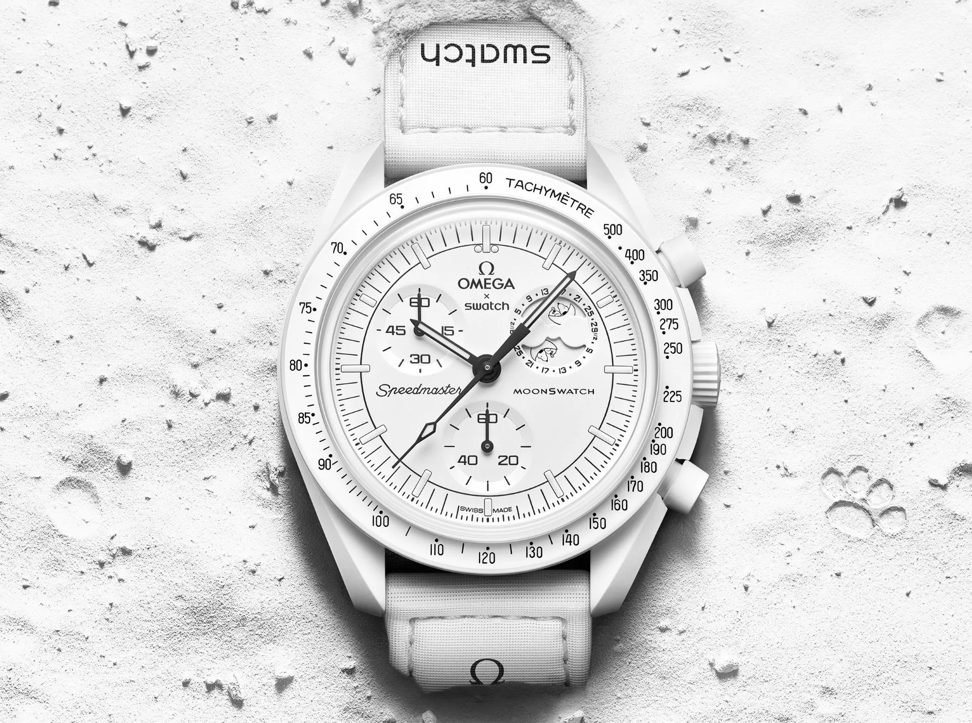 “Houston, the Bioceramic MoonSwatch MISSION TO THE MOONPHASE has landed. A new model, all in white to celebrate the full moon, has touched down on the moon smoothly, in the planned location and on schedule.”