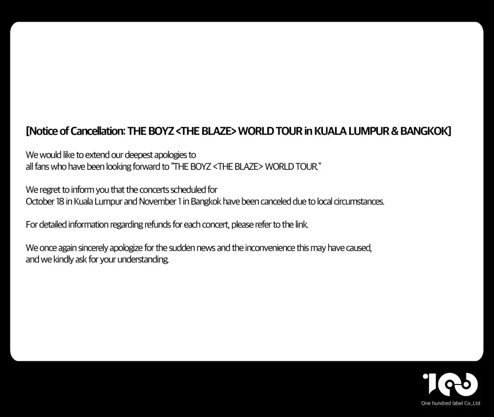 On Sunday (5 October), 100 Label issued an official statement informing fans that THE BOYZ’s scheduled concerts in Kuala Lumpur (18th October) and Bangkok (1st November) had been cancelled due to “local circumstances”. This now means that the upcoming show in Jakarta will be the group’s only performance in Southeast Asia. “We once again apologise for the sudden news and the inconvenience this may have caused, and we kindly ask for your understanding,” the company wrote.