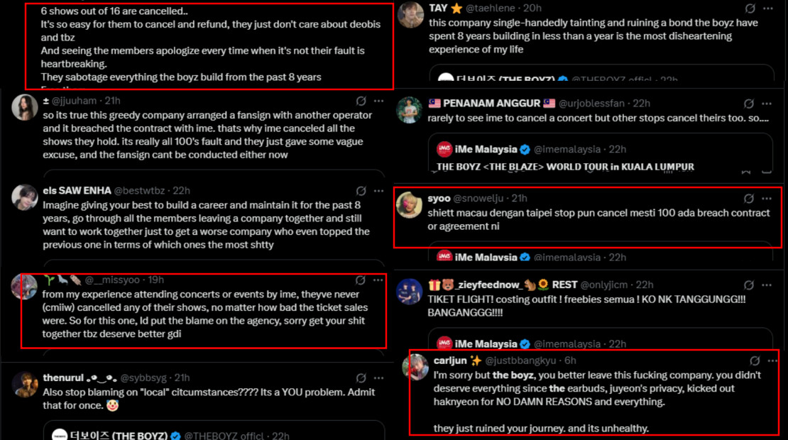 As expected, the announcement sparked outrage among fans. Many accused the agency of deliberately sabotaging THE BOYZ’s image through the cancellations and poor management. Others speculated that the agency had breached contracts with concert organiser iME at these locations, thereby forcing the organiser to cancel the performances. Fans also urged the group to leave the agency, noting that the concert cancellations were only one of many issues the company has allegedly caused.