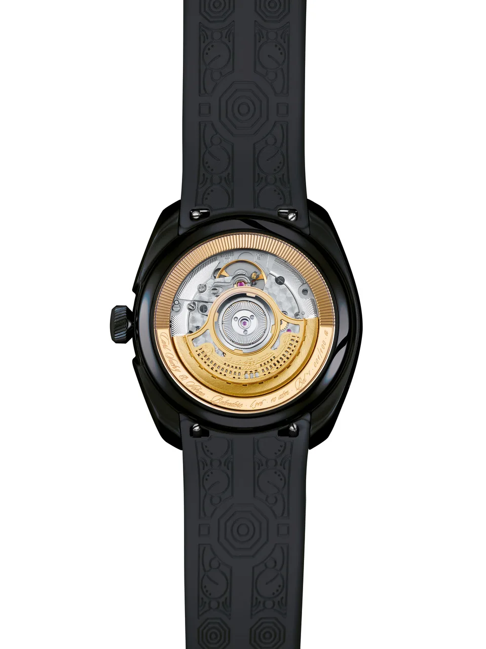 The golden rotor with the micro-engraved façade of the world-famous Belvedere Palace in the heart of Vienna and the embossing of the baroque garden on the inside of the integrated rubber strap underline the attention to detail of the collection.