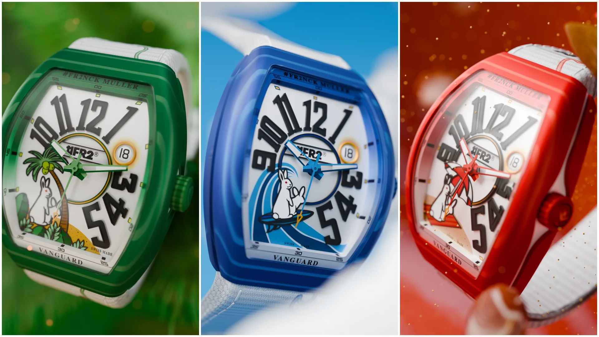 This year’s follow-up from Franck Muller and #FR2 features the same Fxxking Rabbits motif, of course. In lieu of a monochromatic palette, however, the new #FR2NCK MULLER Vanguard Beach Limited Edition comes decked out in vivid summer hues to evoke the carefree spirit of sun-soaked days and sea breezes – a throwback to the Franck Muller Vanguard Beach collection that was also released in 2023.