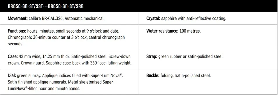 At the heart of the BR 05 family, the new Green Steel is part of the brand’s range of chronographs, featuring the mechanical self-winding BR-CAL301 movement. This robust calibre delivers great reliability and considerable efficiency. Visible through the sapphire crystal case back, the rotor is a finely skeletonized full disc inspired by a car rim: a characteristic signature of Bell & Ross automatic movements.