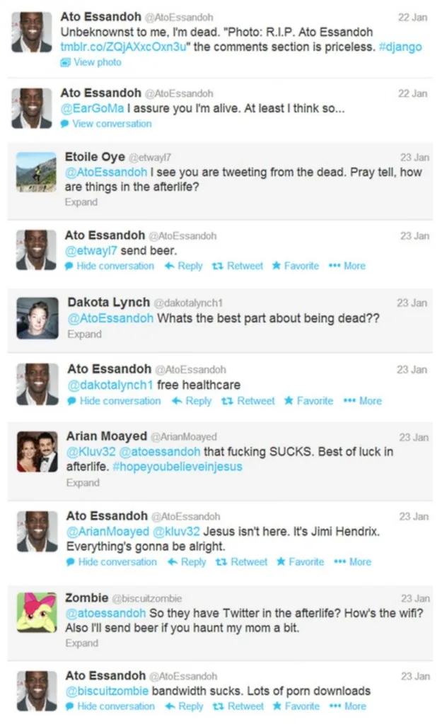 The best part of it is Ato Essandoh tweeted, seemingly from “beyond the grave” to uh, “clarify” the situation: