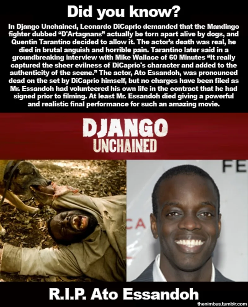 Torn apart alive by dogs? Sure sounds like one of the worst ways to die. Anyone who has encountered the post above must’ve tried real hard to battle between feeling sorry for Ato plus the entire cast and crew of “Django Unchained” and applauding the actor for being so dedicated to his job.