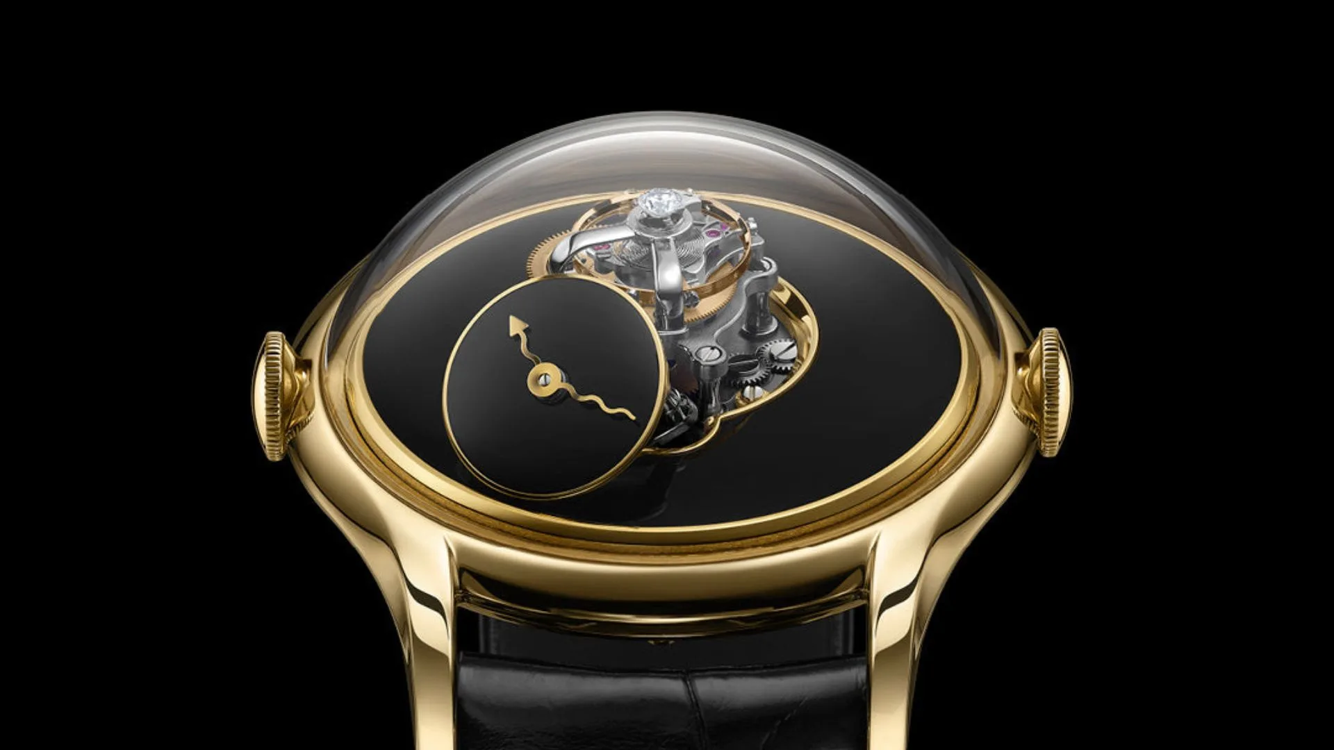 The overall piece measures 38.5mm in case diameter, including the high domed sapphire crystal case, and it’s all held together by calf or alligator leather straps with a pin buckle that matches the case.