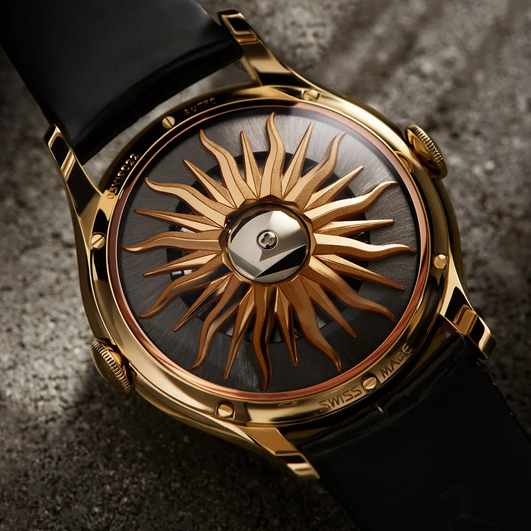 But it’s what’s behind the sun that makes this watch tick. Designed in-house by MB&F, the piece features an automatic-winding, three-dimensional vertical architecture geared with a central flying 60-second tourbillon and a 100-hour power reserve.