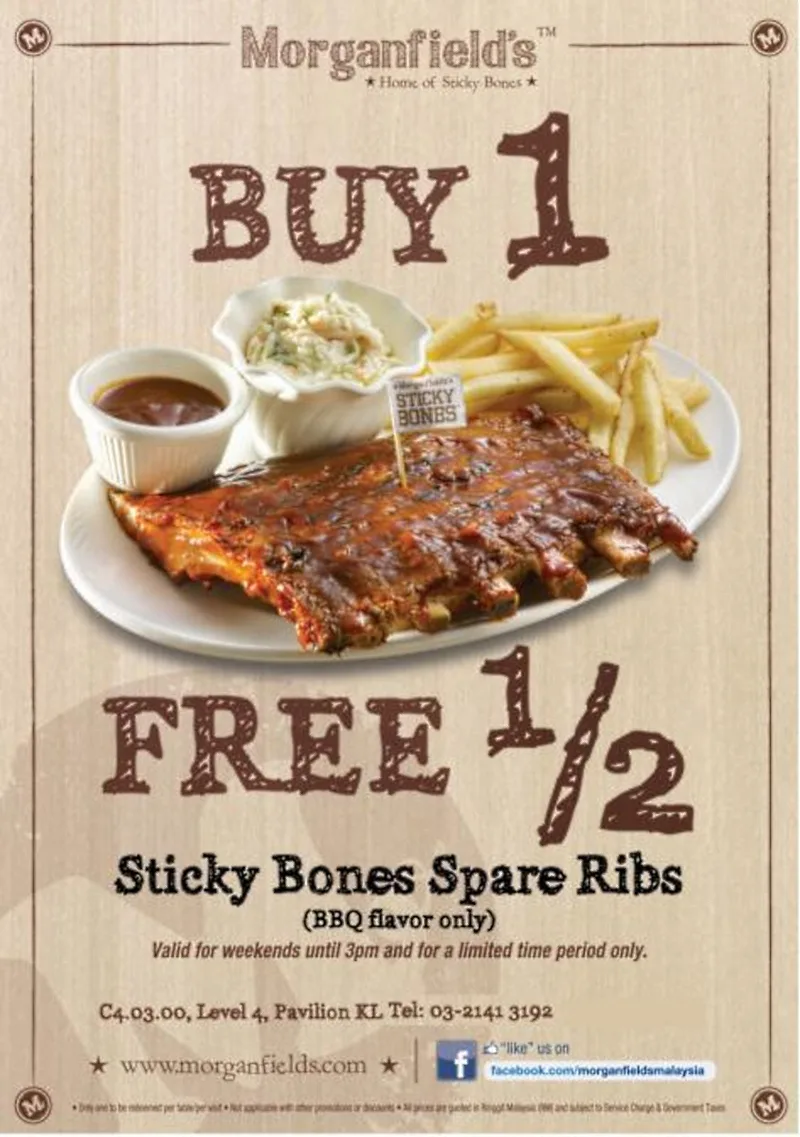 Tempted yet? But wait, before you take a bite out of your computer screen (or phone screen, or tablet, or whatever), Morganfield’s have got great news for new and returning patrons! For a limited time only, they are offering you a reason to celebrate your weekends with a special “BUY 1 FREE 1/2 Sticky Bones Spare Ribs” deal!
