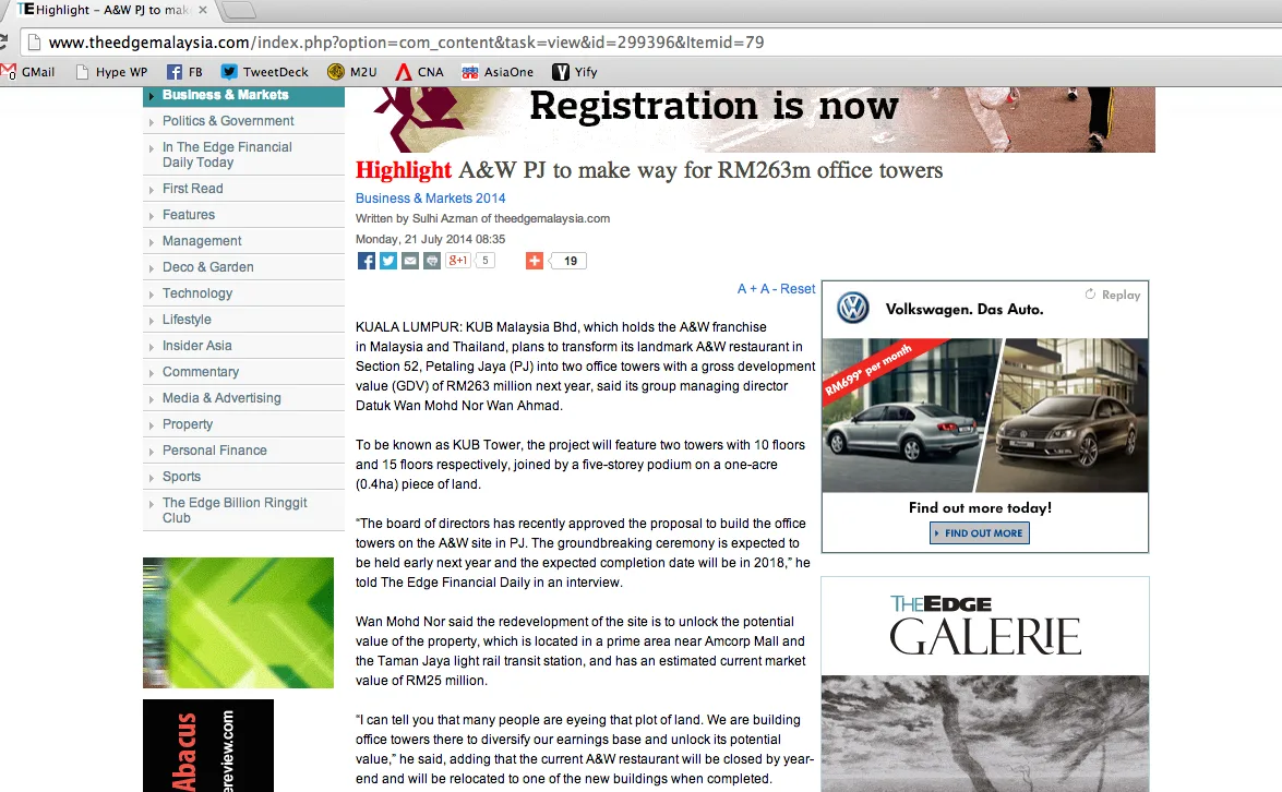 However, this report is different from The Edge Malaysia’s, who quoted KUB Malaysia Sdn Bhd group managing director Datuk Wan Mohd Nor Wan Ahmad in an interview and said that the current A&W restaurant will be closed by year-end and relocated to one of the new buildings when completed.