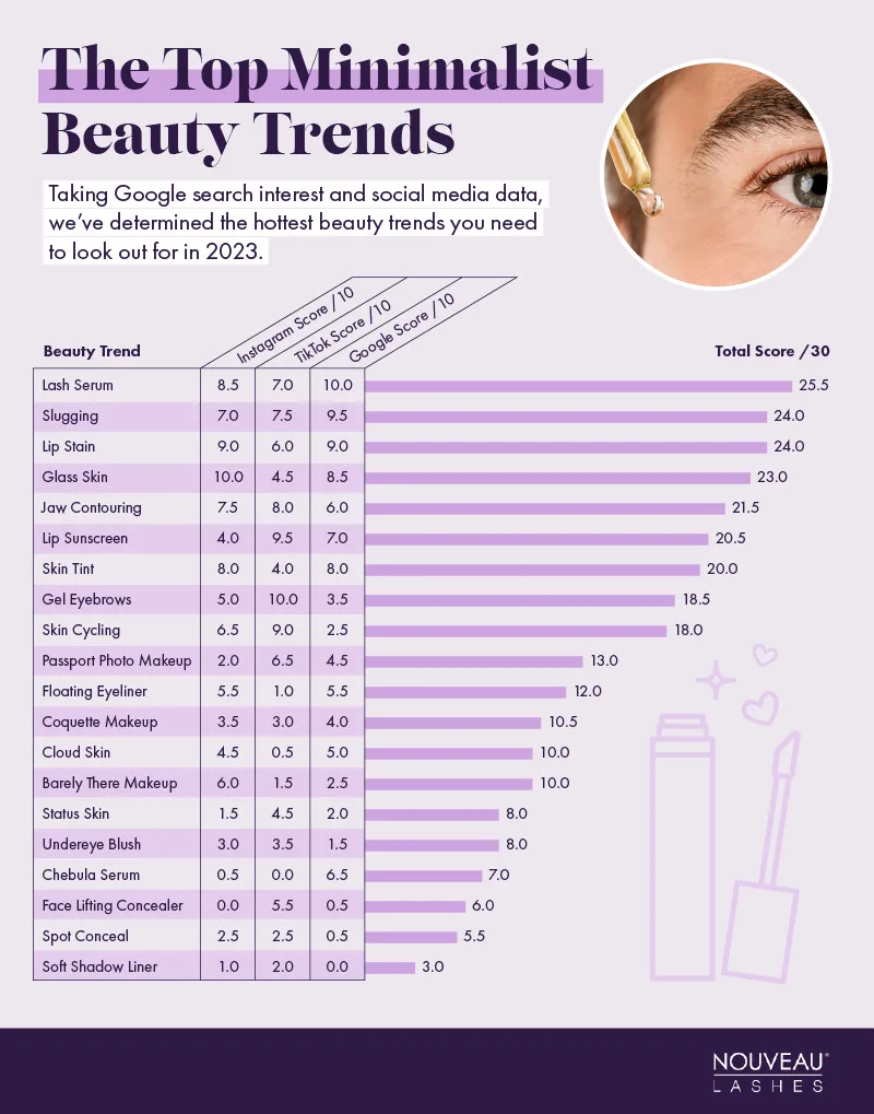 When it came to beauty crazes taking the internet by storm, lash serum stole first place with an impressive score of 25.5/30 overall. This ranking was thanks to a staggering 203,000 hashtags on Instagram, as well as 743 million TikTok views. This led to the humble lash serum receiving 8.5 when it came to its impact on Instagram, and 7/10 when it came to TikTok.