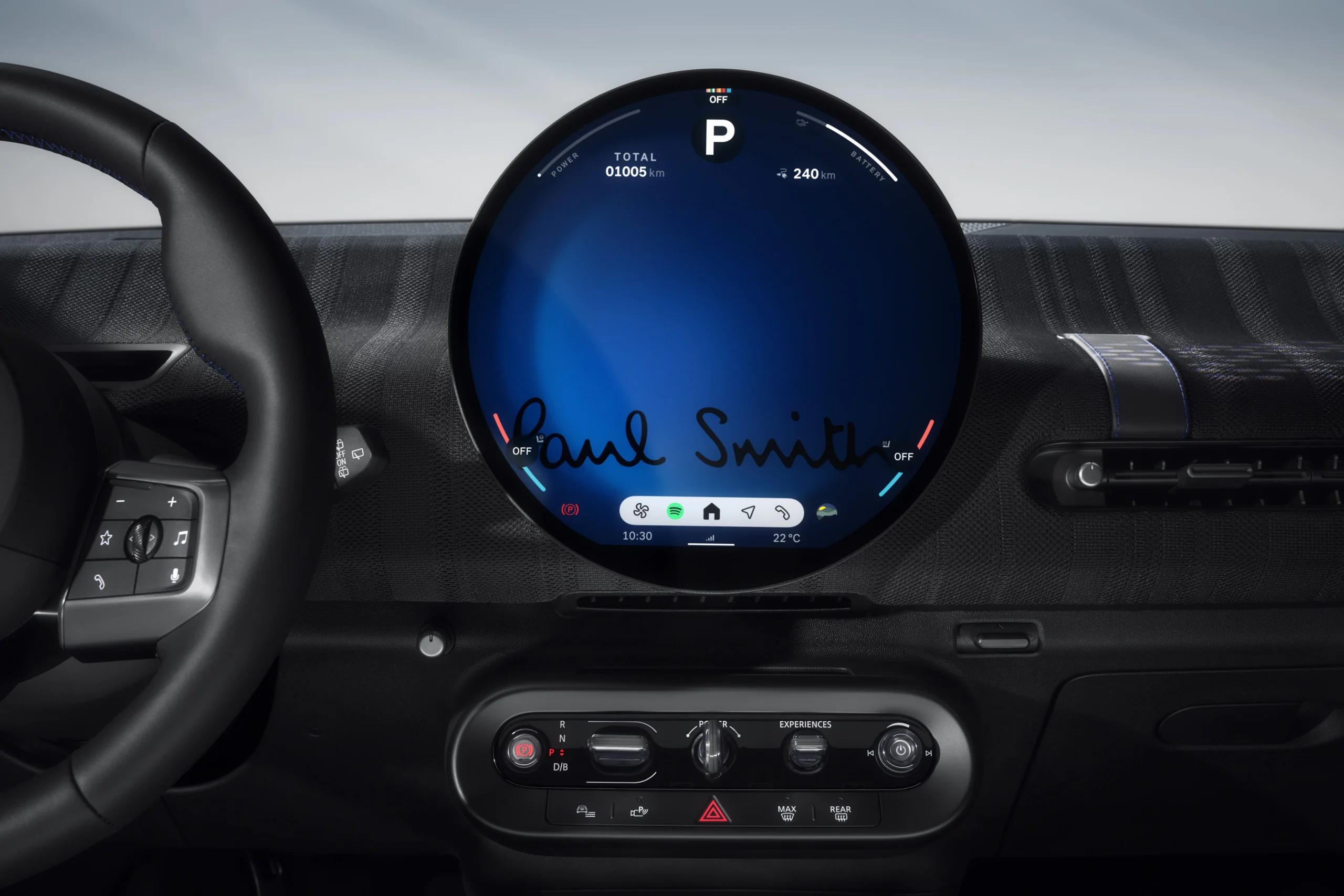Meanwhile, the door sill cover strip greets with the uplifting message “Every day is a new beginning!” in Paul Smith’s handwriting, while his familiar hand-drawn rabbit motif embroidered into the floor mat adds another signature style. On the steering wheel, which takes on a traditional 3-spoke design, a textile band with the iconic Paul Smith Signature Stripe provides a lively splash of colour, offset by the Paul Smith brand logo. Additionally, the MINI Interaction Unit offers three exclusive backgrounds designed by Paul Smith for Personal Mode, with the colourful Signature Stripe subtly integrated at the upper edge of the display, creating a unique and personal experience.