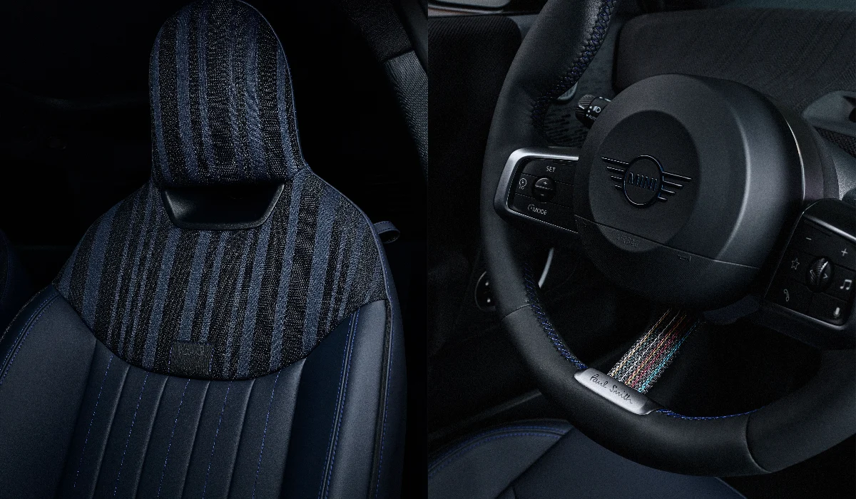 Inside, the interior is enriched with Nightshade Blue JCW Sports seats in Vescin upholstery. The seats feature a Shadow Stripe knit section on the shoulder and headrest areas, while a Paul Smith label emphasises the exclusive nature of the design. Another standout feature inside is the Shadow Stripe upholstery that stretches across the full width of the instrument panel. The upholstery material has a consistent colour throughout, but alternating finishing directions create a special stripe design inspired by Paul Smith’s Signature Stripe. The passenger side of the instrument panel also features a decorative black leather band with blue stitching, adding a refined touch to the cabin.