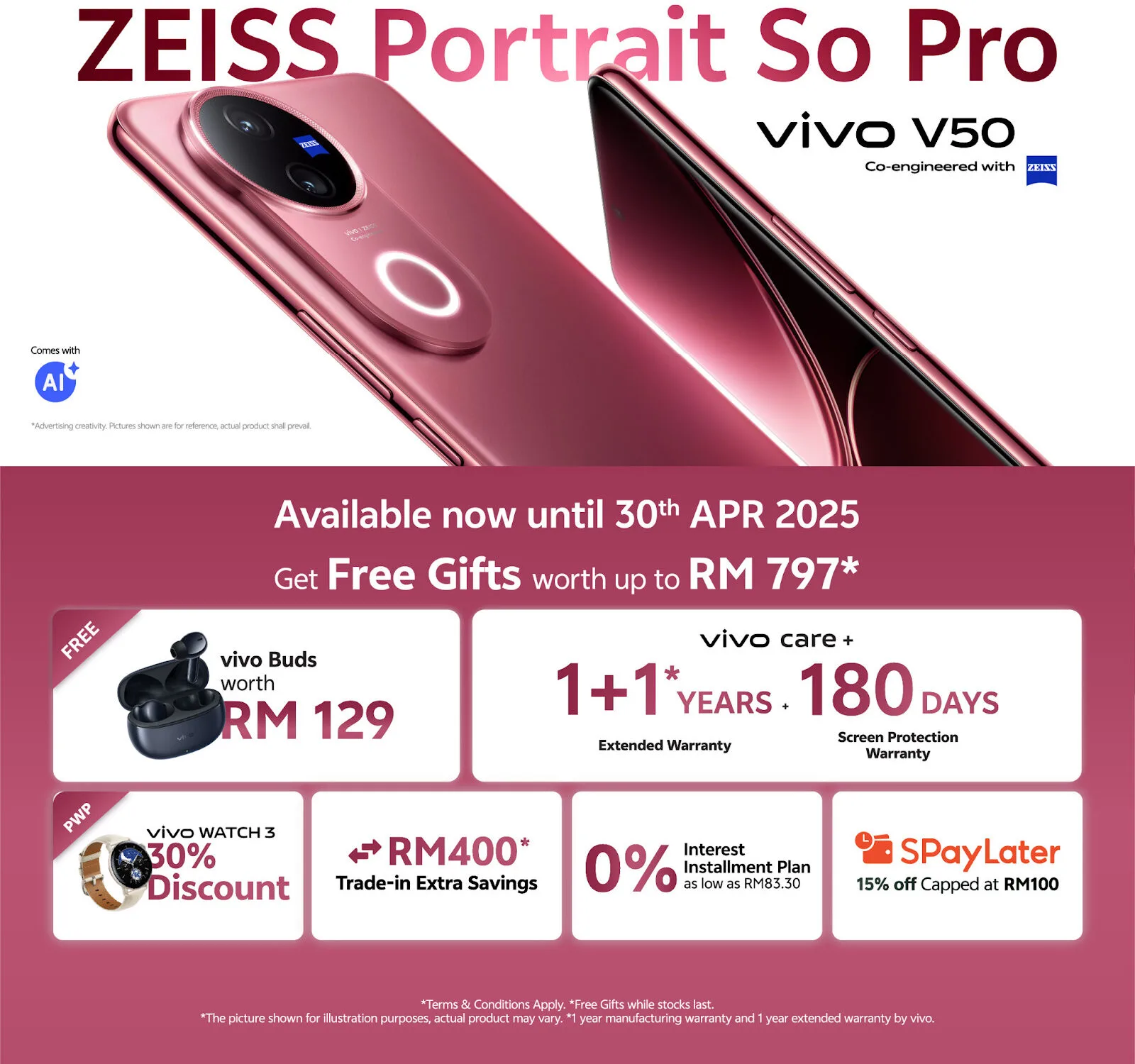 You can now get your very own vivo V50, for as low as RM1,999 at vivo official stores or retailers. Furthermore, if you purchase a V50 this holiday season, you are entitled to receive exclusive gifts worth up to RM797, like vivo Care 1 +1 Year Extended Warranty, vivo Care 180 Days Screen Protection, vivo Buds (RM129), RM400 Trade-in Extra Savings, and a 30% discount on a vivo Watch 3. To stay up to date, be sure to follow vivo’s official Facebook, TikTok, and Instagram accounts.