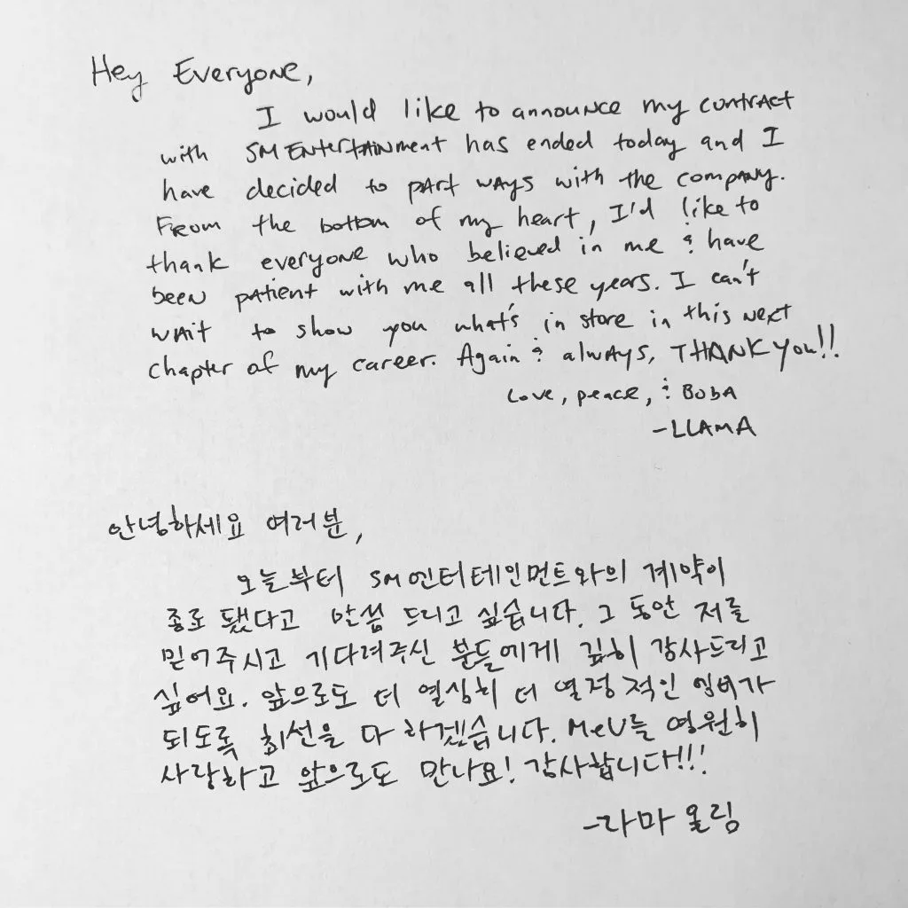 “Hey everyone, I would like to announce my contract with SM Entertainment has ended today, and I have decided to part ways with the company. From the bottom of my heart, I’d like to thank everyone who believed in me and have been patient with me all these years. I can’t wait to show you what’s in store in this next chapter of my career. Again and always, thank you!! Love, peace, and Boba –Llama.”