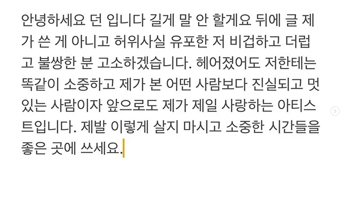 “Hello, this is Dawn. I’ll keep it brief. The post in the second image was not written by me. (To) the sad, dirty coward who spread those lies, I will sue you. Even if we’ve broken up, she’s still someone that I cherish, the most honest and respectable person I have known, and she will always be my favourite artist. Please, don’t live like that. Put your precious time on earth in a good way.”