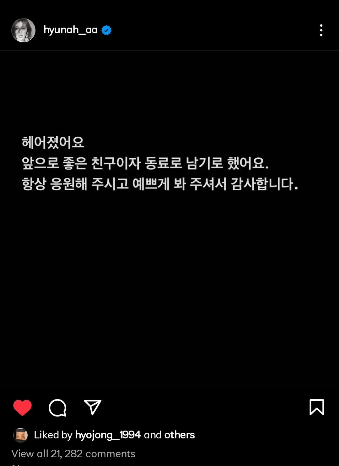 The former 4Minute member was the first to break the news to her fans. She wrote, “We broke up. We’ve decided to be good friends and coworkers. Thank you all for being supportive of our relationship.” Shockingly, DAWN was also spotted “responding” to the announcement by liking HyunA’s post, further signaling the end of their long-term relationship.