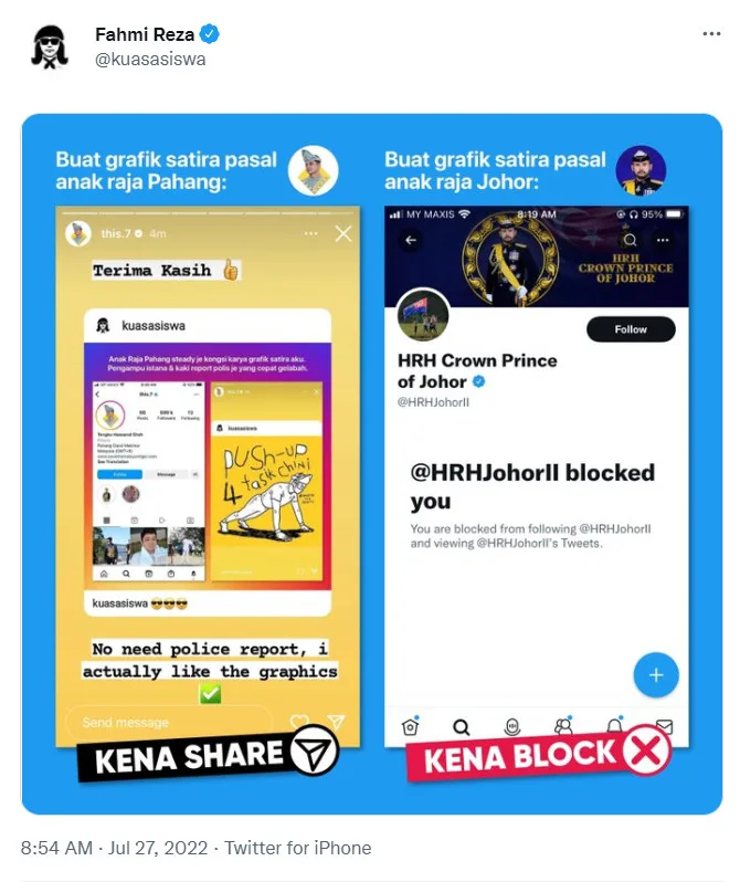 For those in the dark, Fahmi’s Twitter was blocked by TMJ’s account a while back, after he posted several satirical pieces on the Johor Prince. After getting the green light by Tengku Hassanal regarding his recent artwork on him. the street artist went on to compare how the Pahang Prince understands and accepts his work, while on the other hand, TMJ blocks him on social media.