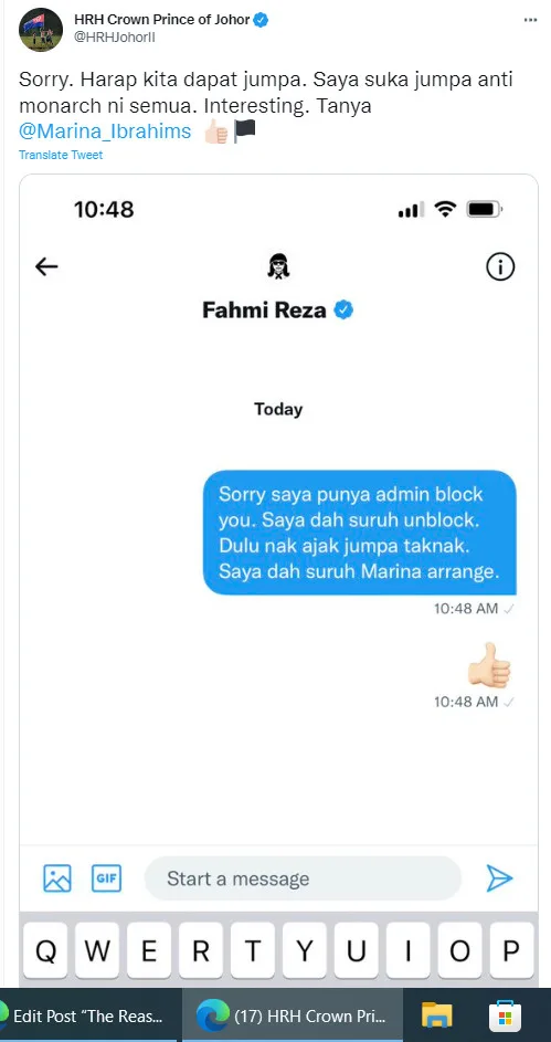 It didn’t take long before Fahmi’s post came to TMJ’s attention. As seen in the photo shared by TMJ, he wrote to Fahmi, “Sorry. My admin had blocked you (online). I’ve told them to unblock you. I invited you to meet back then but you didn’t want to. I will ask Marina to arrange.” He also tweeted, “Sorry. Hope we get to meet. I like to meet those who are anti-monarchy. Interesting.”