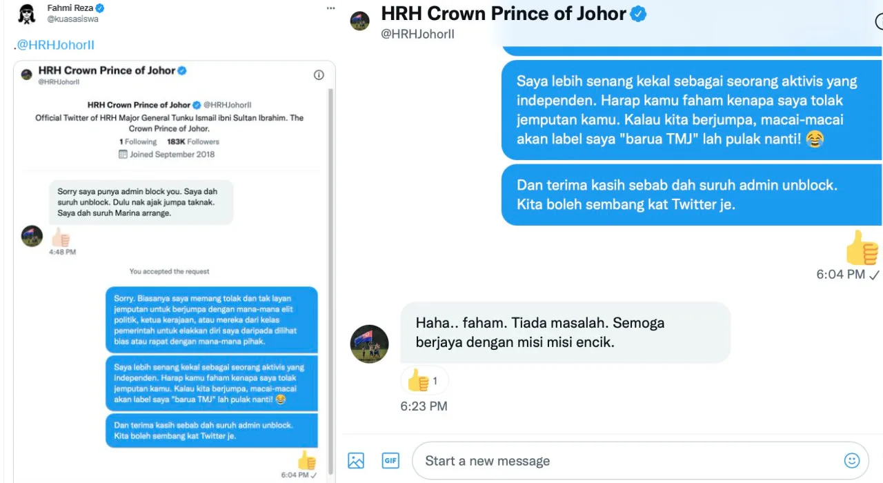 He added by telling the 38-year-old prince that it would be easier for me to remain as an independent activist. “I hope you understand why I rejected your offer. If we were to meet, all of the political sheep will label me as ‘TMJ’s lackey’. Thank you for asking your admin to unblock. We can just talk through Twitter,” Fahmi wrote in his DM to the newly-appointed Regent of Johor.