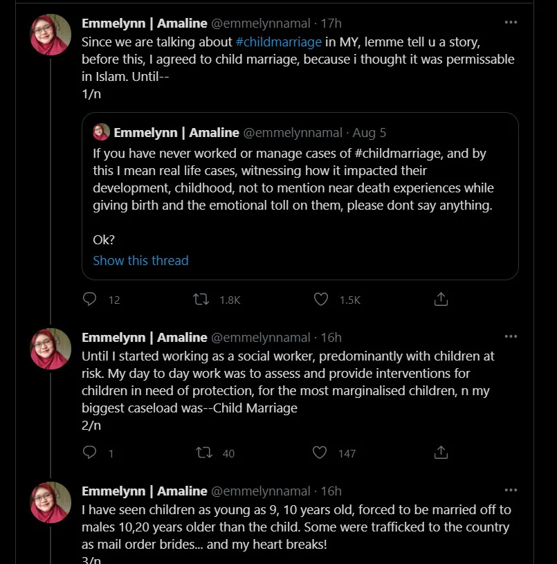 In relation to this, several Malaysian Twitter users have chided child marriages on the popular social media application. Twitter user, @emmelynnamal, claimed that she agreed to child marriages previously because it was permissible in Islam. However, when she started working as a social worker, predominantly with at-risk children, her biggest caseload was child marriages. She had seen children as young as 9 and 10 years old, being forced to be married off to males 10 to 20 years older than themselves.