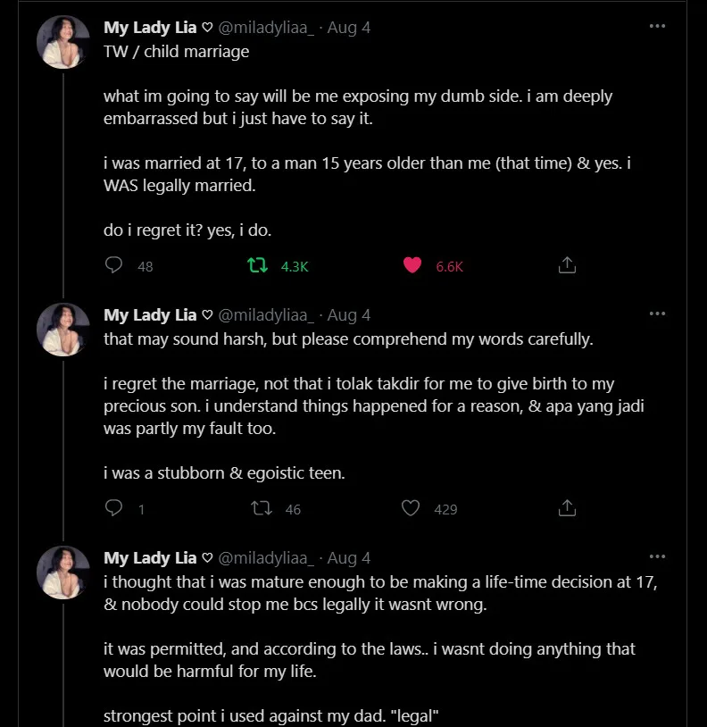 Another Twitter user, @miladyliaa_ said that she was a victim of the scenario aforementioned. At the age of 17, she was legally married to a man 15 years older than her — because they loved each other. She clearly regrets the incident and claims that what happened was partly her fault because she was a stubborn and egoistic teen. At that age, she thought that she was mature enough to be making a life-changing decision and since nobody could stop her since legally it wasn’t wrong, she proceeded to marry the guy.