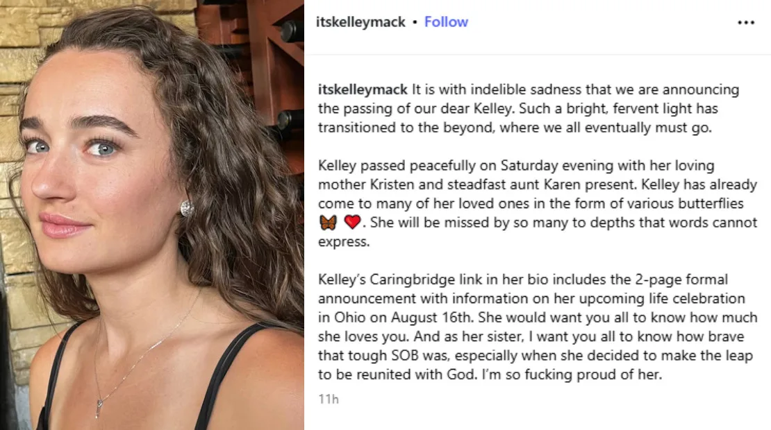 “It is with indelible sadness that we are announcing the passing of our dear Kelley. Such a bright, fervent light has transitioned to the beyond, where we all eventually must go. Kelley passed peacefully on Saturday evening with her loving mother Kristen and steadfast aunt Karen present. Kelley has already come to many of her loved ones in the form of various butterflies 🦋 ❤️ She will be missed by so many to depths that words cannot express,” the caption reads.