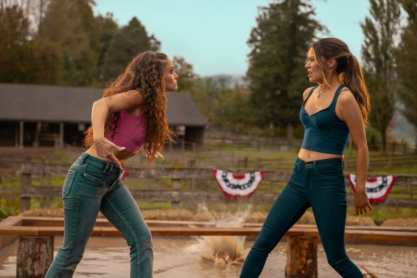 Cosgrove, to her credit, leans more naturally into slapstick than swooning. She jumps into mud, smacks her castmates around, and clings to a mechanical bull for dear life. Those beats sort of land; the romance doesn’t.