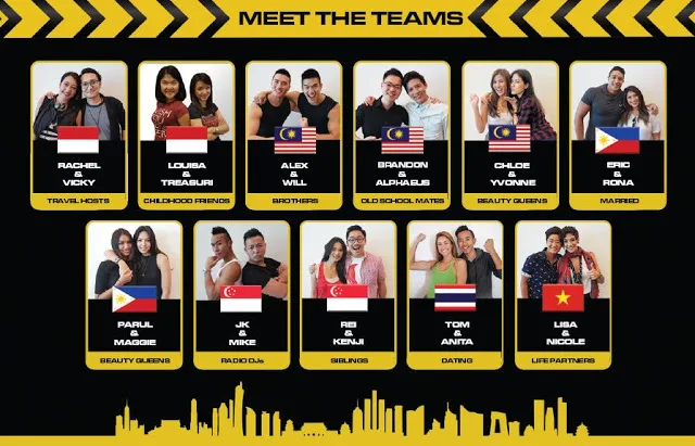 The 3 teams representing Malaysia are brothers Alex and Will Chee (aka the Muscle Brothers), girl pals Yvonne Lee and Chloe Chen who are also title holders of Miss World Malaysia 2012 and 2011 respectively, as well as 8TV Quickie host Brandon Ho together with his school mate Alphaeus Tan.